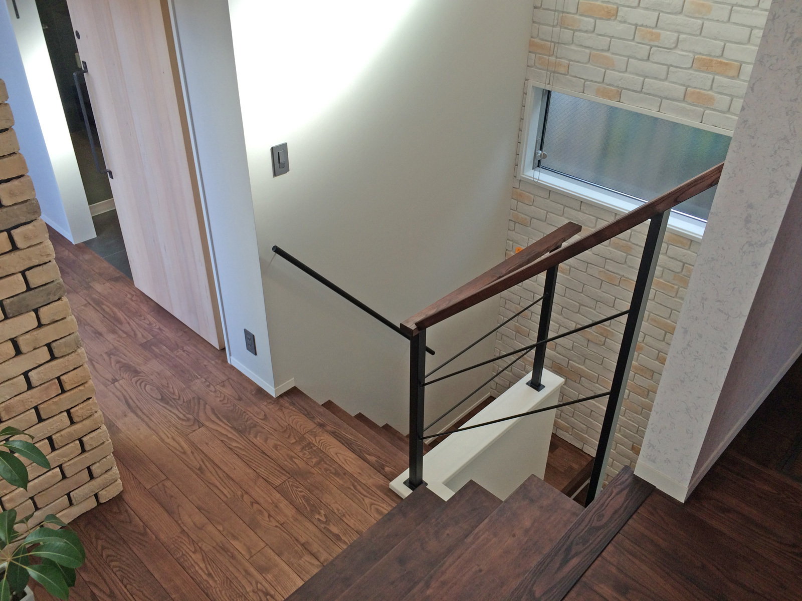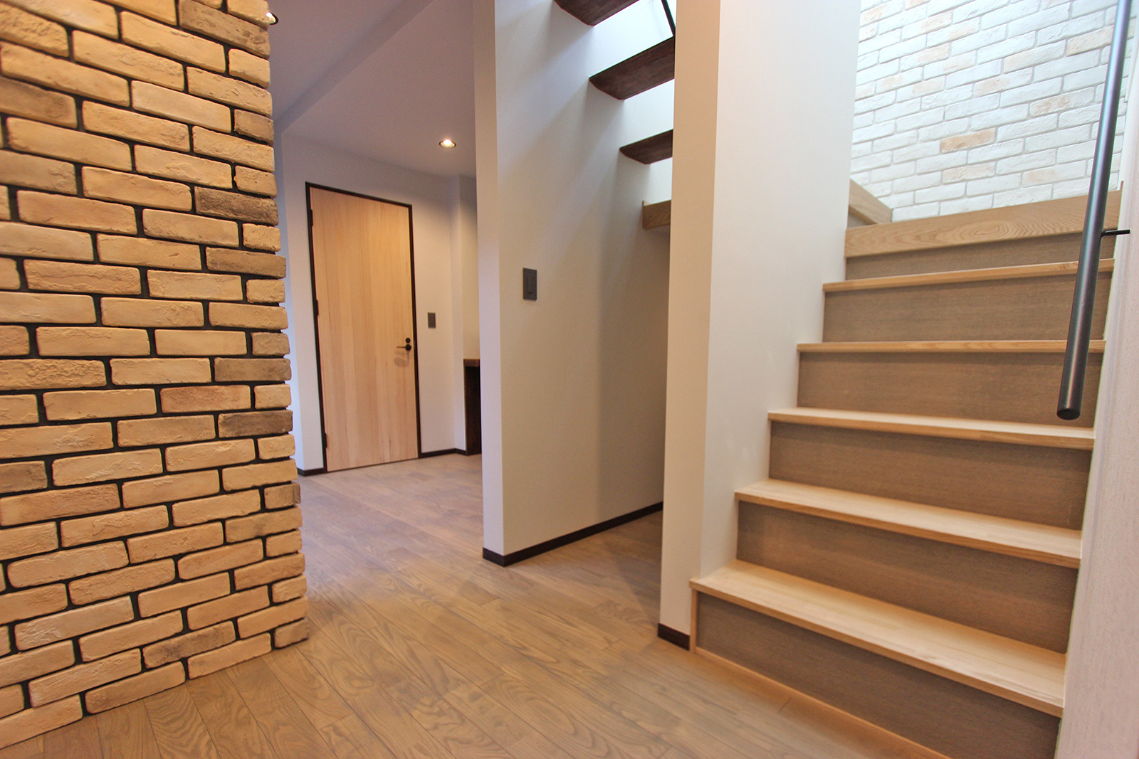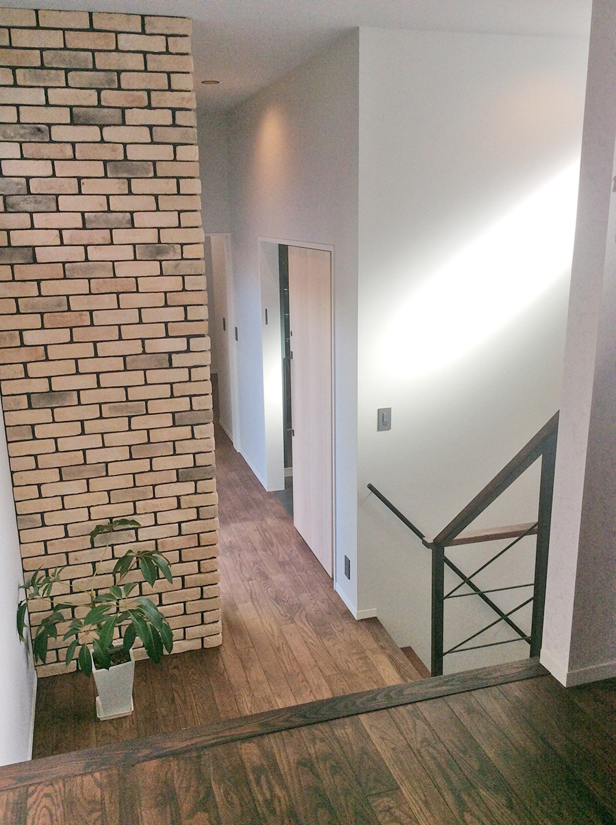 室内の壁にレンガをはったり、手作り本棚、キッチンの背面収納など、お客様のご要望を取り入れ、オリジナリティーあふれる家ができました。