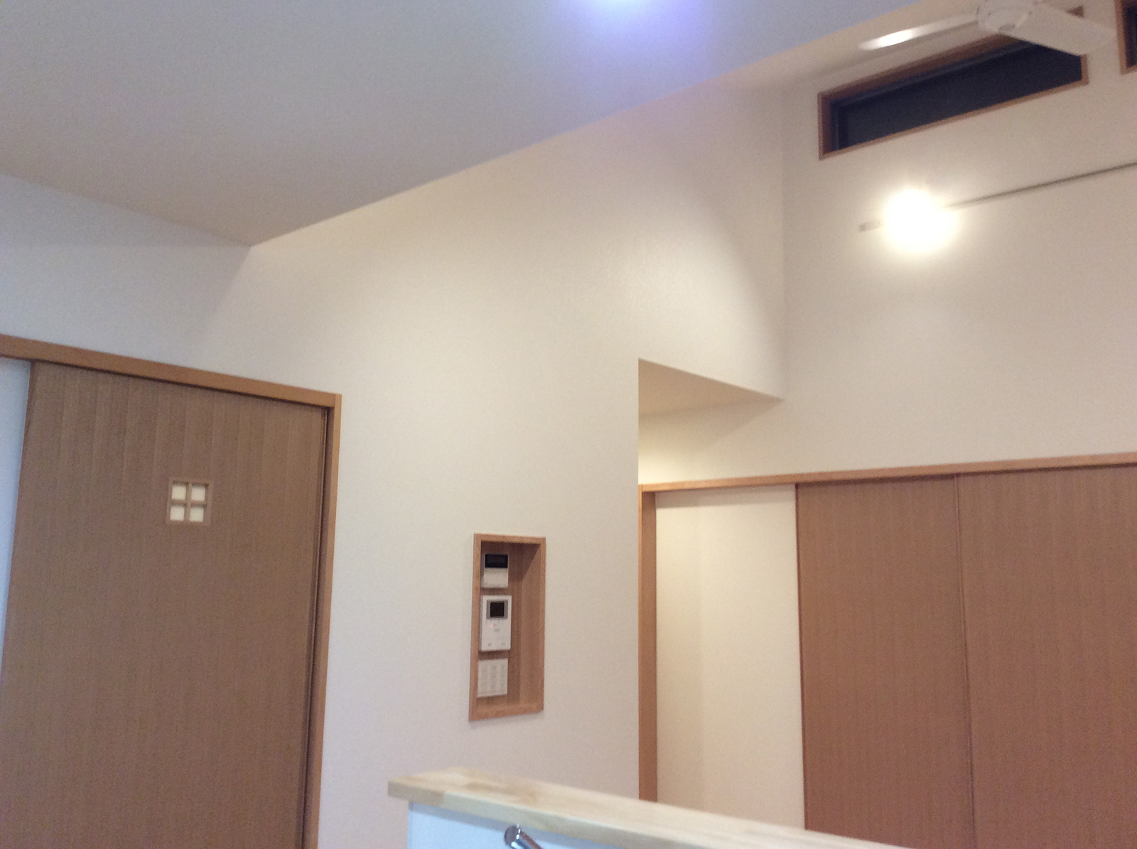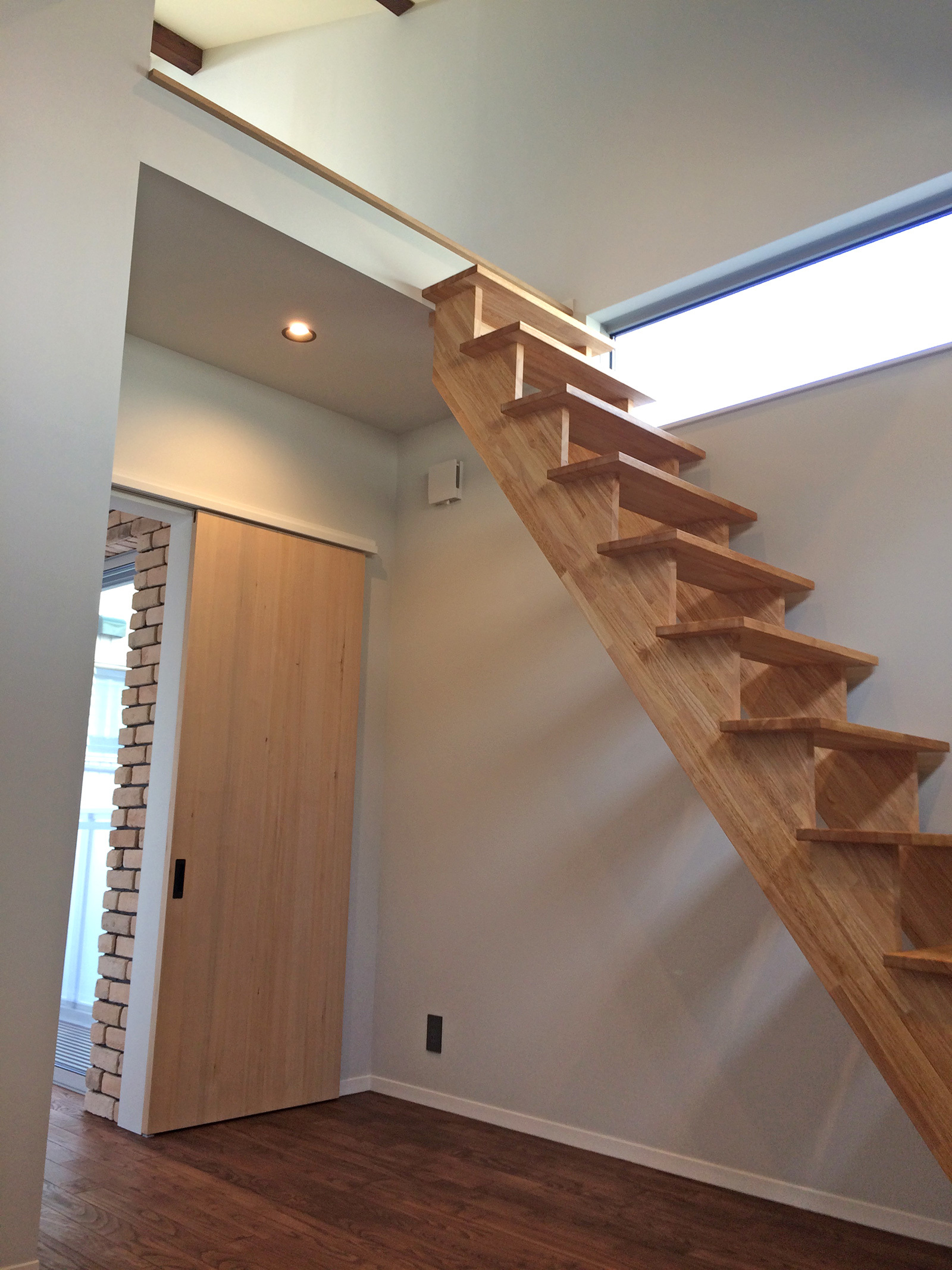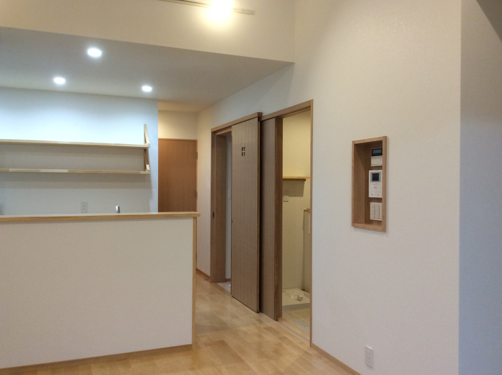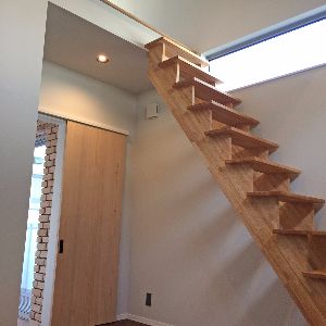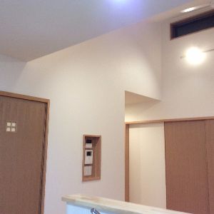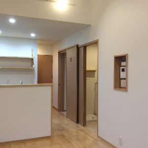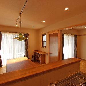 29坪+4(ロフト)の決して広い家ではありませんが、TV台を埋め込んだり、収納を増やす事によって、広さを感じられる家になりました。また、照明、カーテン、スイッチプレート、鏡、タオル掛けなど、施主さんのこだわりが感じられる素敵な家になりました。