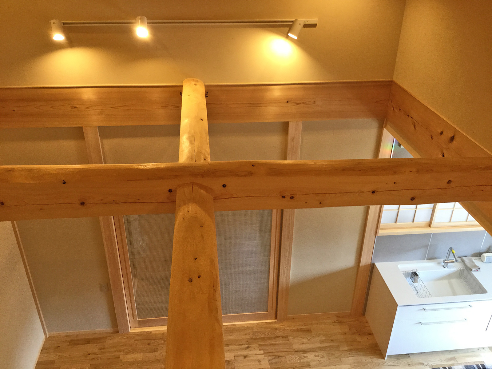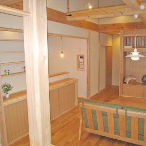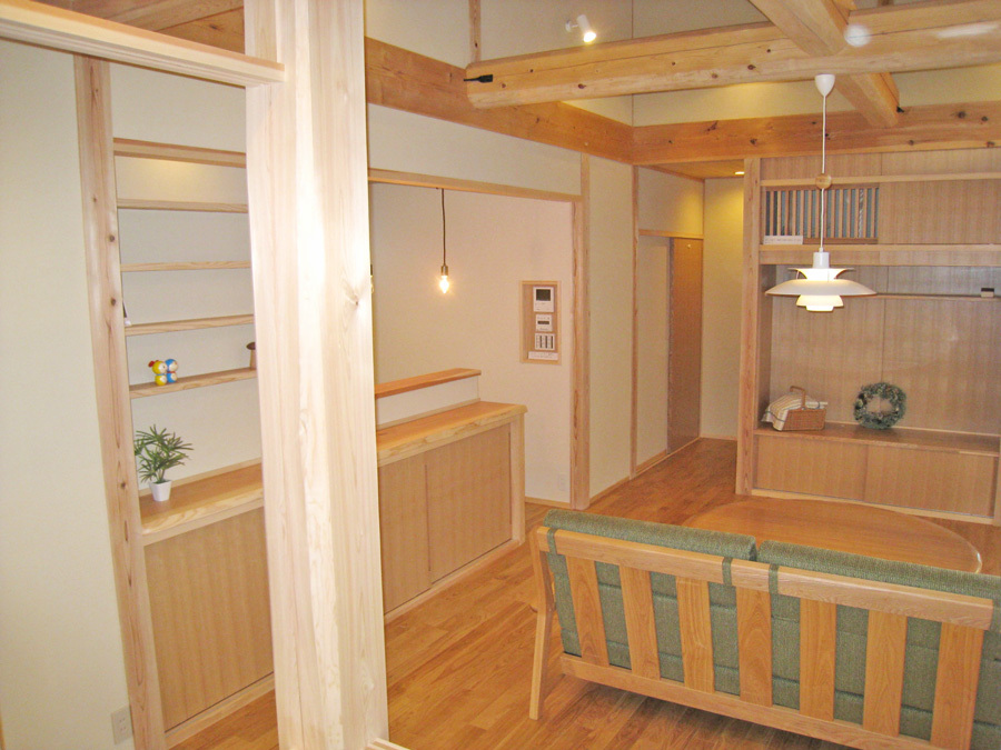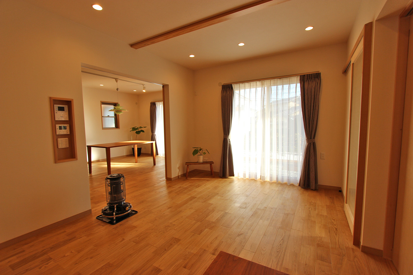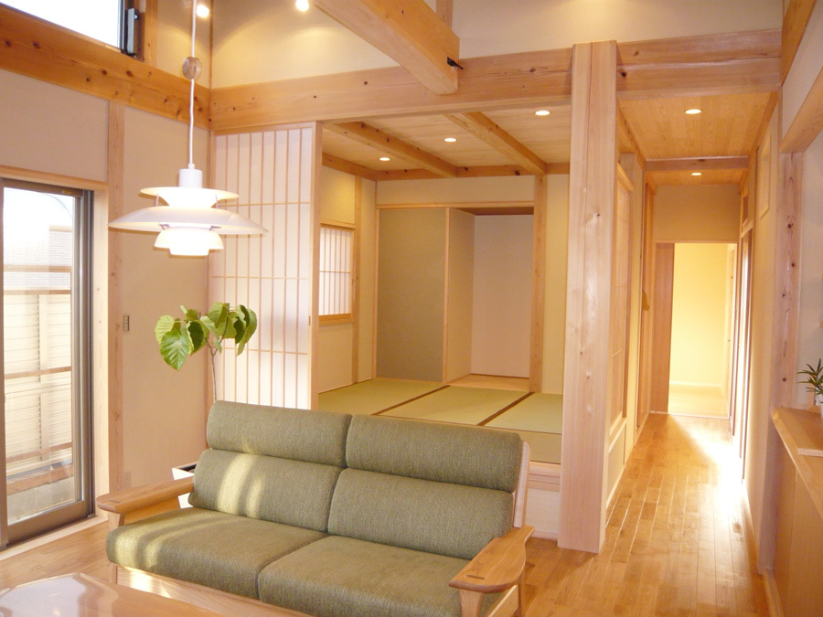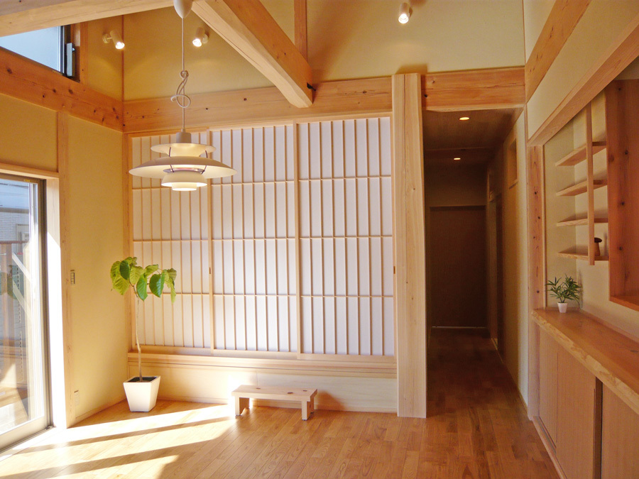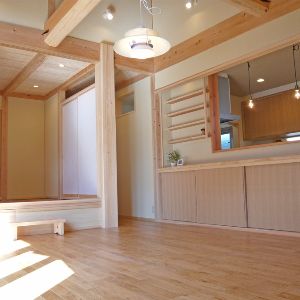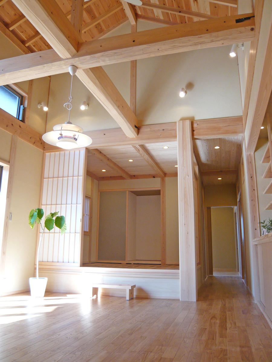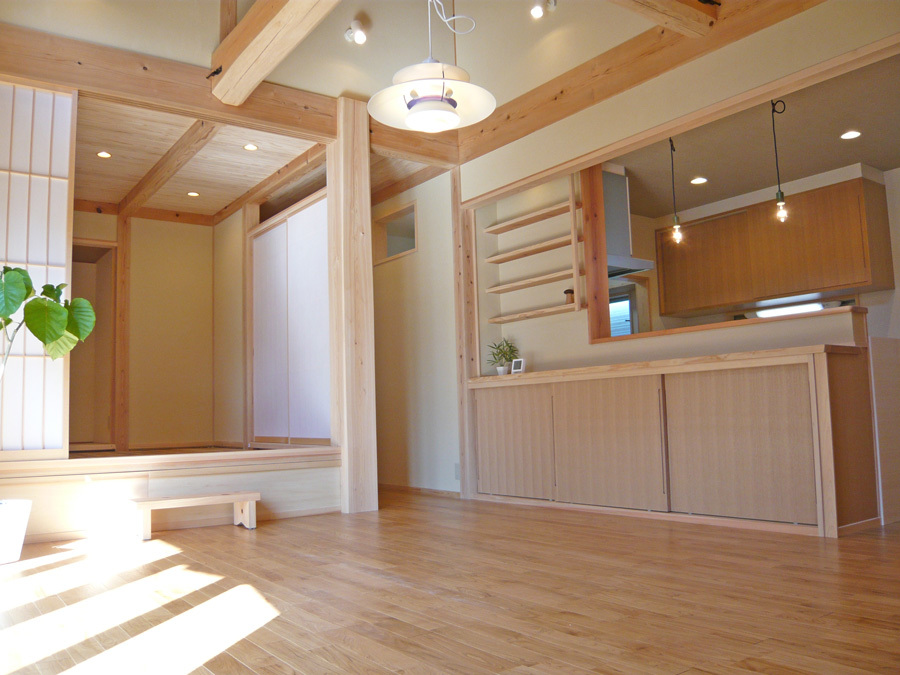 耐震を1番に考えた間取りで、お互いの両親がいつでも泊まりに来られるように和室も作りました。太く大きな梁のあるホールは、今は子供たちが思いっきり遊ぶ空間、そしていつか2世帯に対応出来る様、キッチンを増設する事もできます。