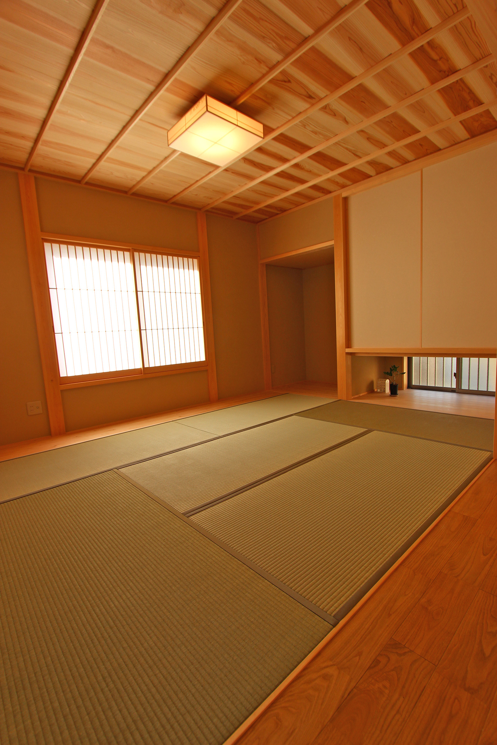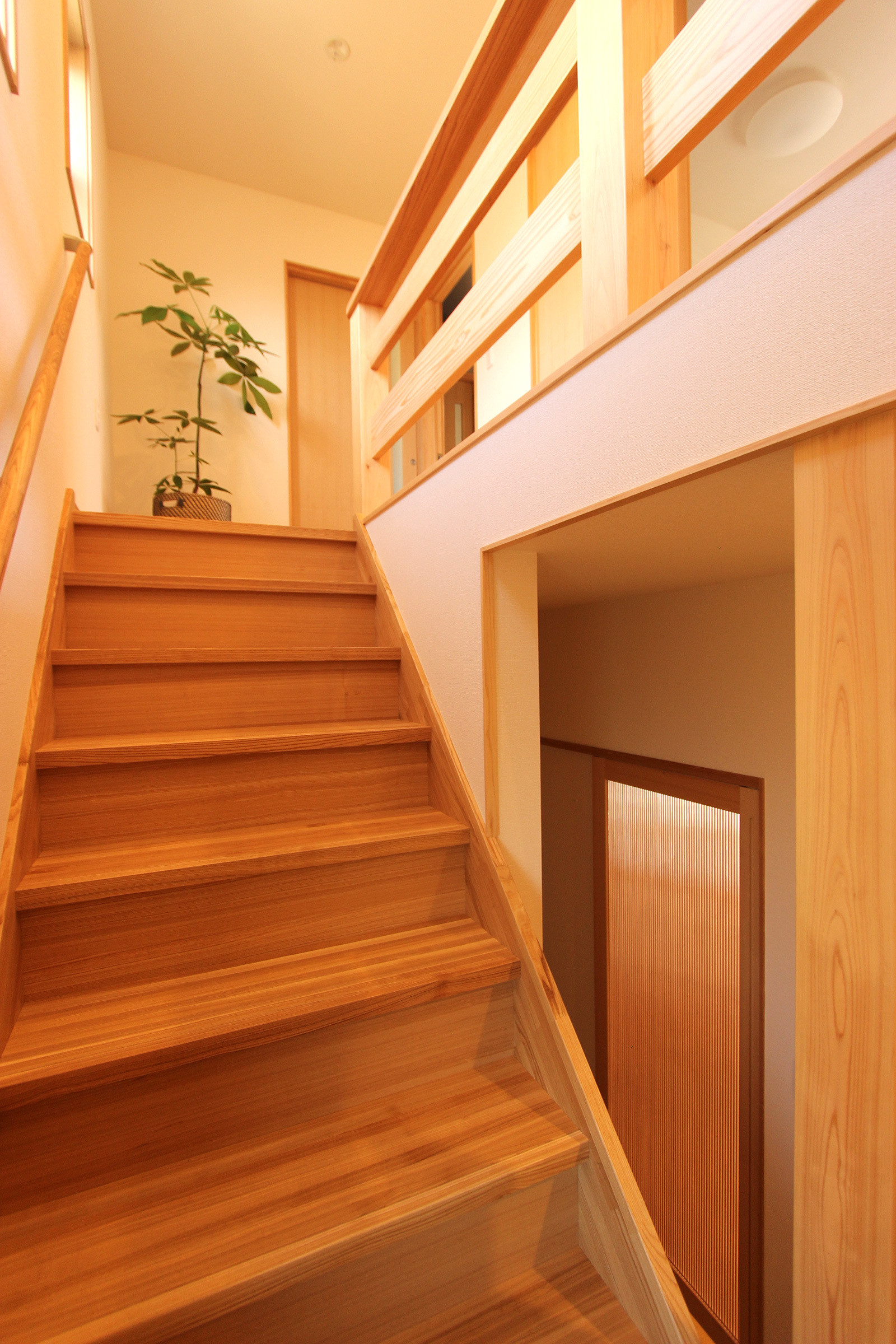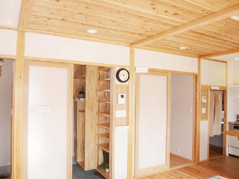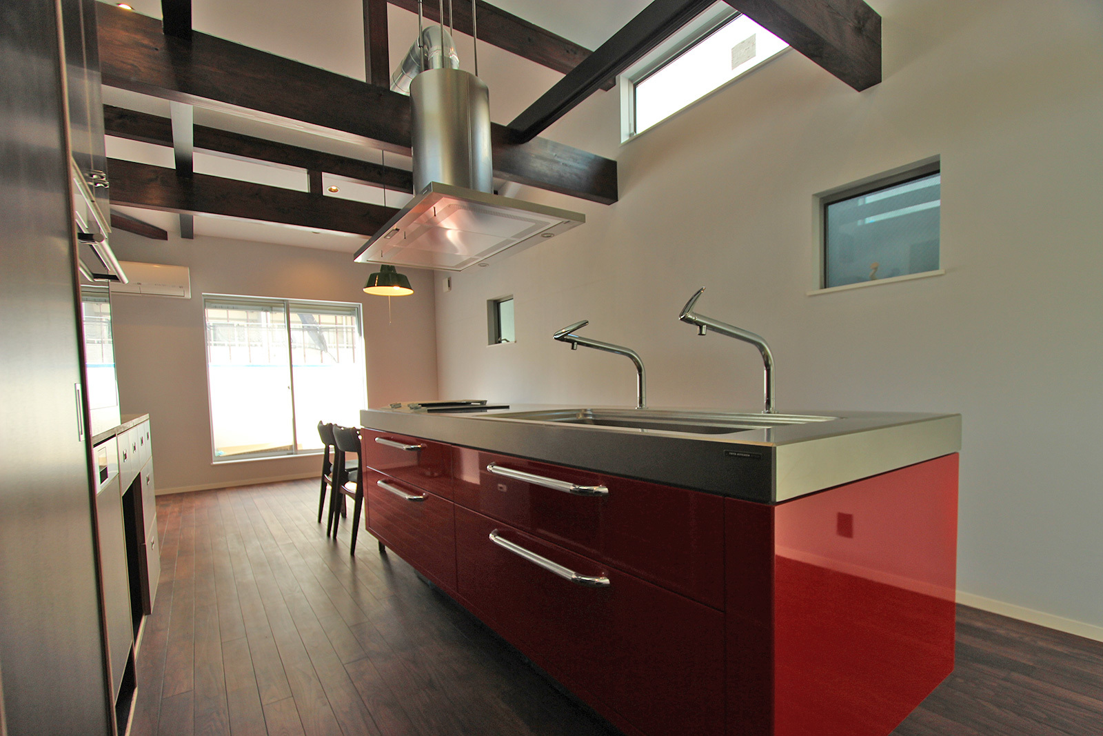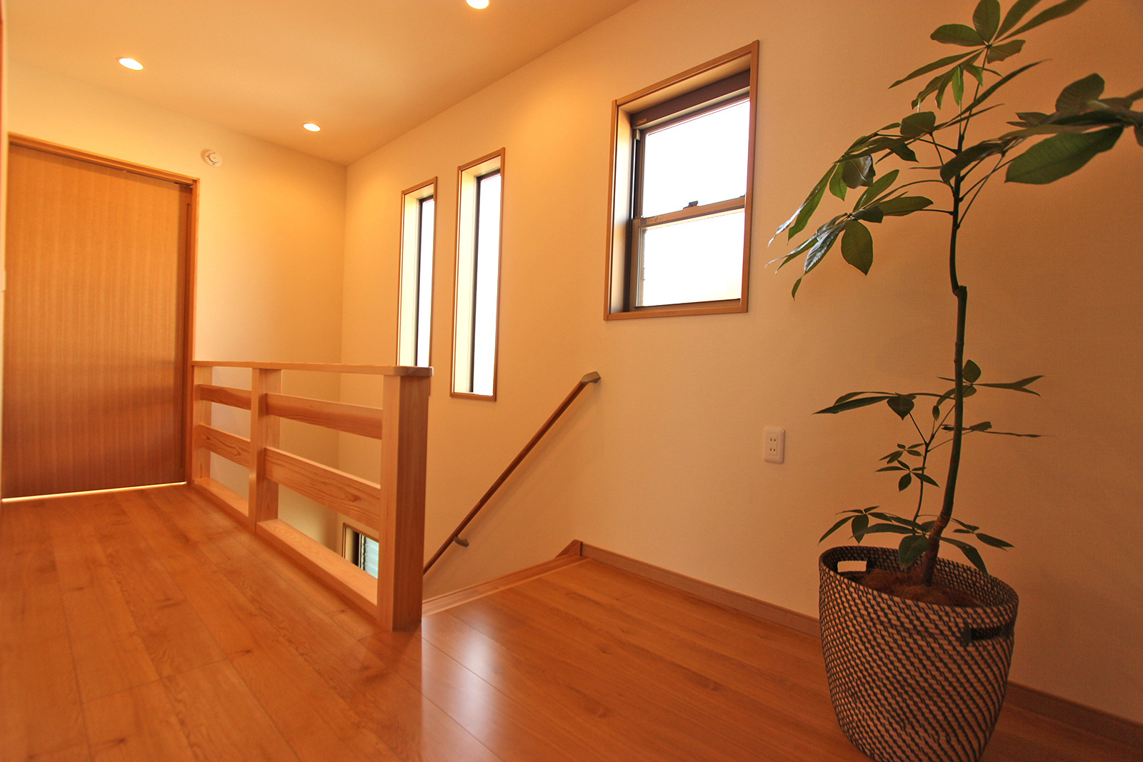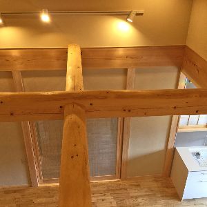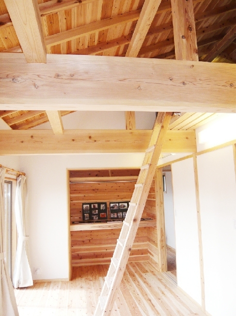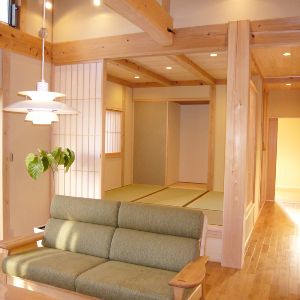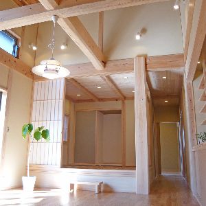 耐震を1番に考えた間取りで、お互いの両親がいつでも泊まりに来られるように和室も作りました。太く大きな梁のあるホールは、今は子供たちが思いっきり遊ぶ空間、そしていつか2世帯に対応出来る様、キッチンを増設する事もできます。